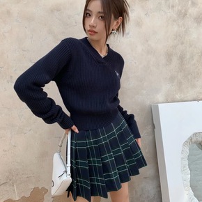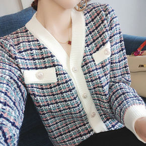 秋装2022新款女装欧美风针织衫女棋盘格紫色可爱贝...
