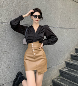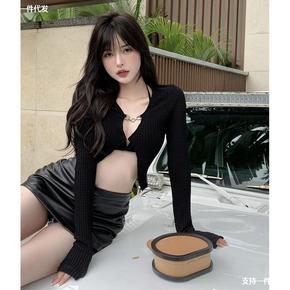 辣妹泡泡皱褶修身短款针织长袖T恤黑色设计感小众V领...
