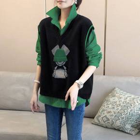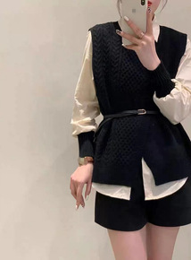 木耳花边翻领衬衫+束腰带开叉洋气针织马甲上衣两件套...