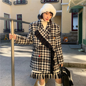 原创复古法式千鸟格粗花呢毛呢外套加棉加厚流苏半身裙...