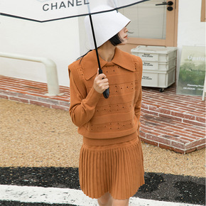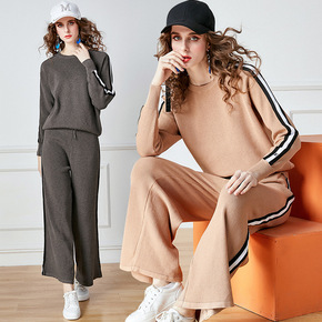 2021秋冬新品休闲宽松拼色长袖针织衫毛衣+阔腿裤...