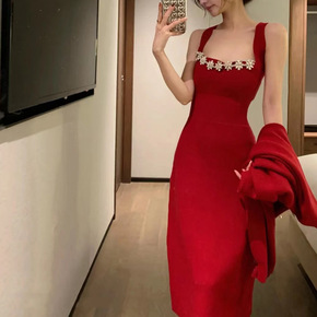 红色新年针织连衣裙女装秋冬本命年时尚打底内搭背心子...