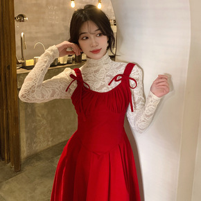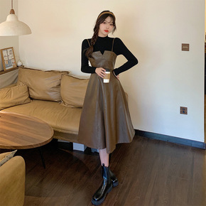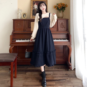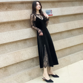 小香风黑色长袖吊带镂空连衣裙绷带跨境亚马逊秋冬时尚...