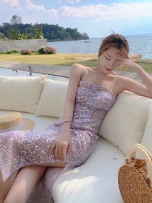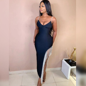 跨境欧美新款性感女装亮片吊带大露背连衣裙派对舞会修...