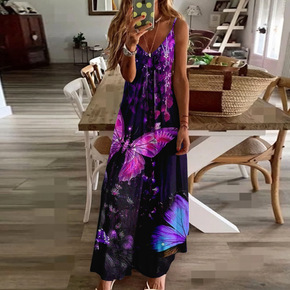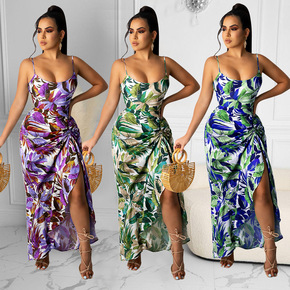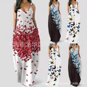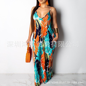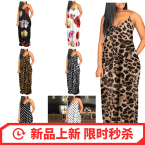 亚马逊Wish跨境女装 欧美性感吊带印花V领长裙 ...