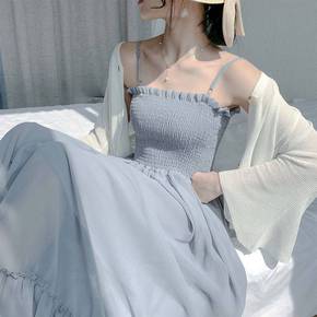 夏季2021新款小清新格子吊带显瘦连衣裙仙女绿色甜...