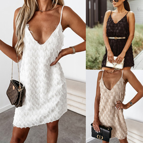 跨境2022欧美新款性感吊带流苏休闲连衣裙 INS...
