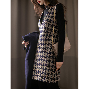 毛呢背心连衣裙女秋冬新款宽松外穿v领优雅气质千鸟格...