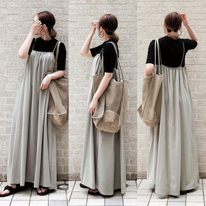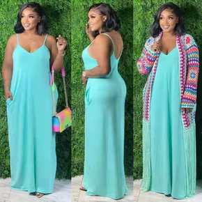 欧美性感新款女装吊带裹胸宽松连衣裙口袋长裙...