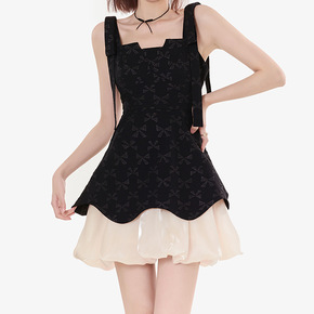 新款甜美短裙2022夏季黑色蝴蝶结印花假两件吊带连...