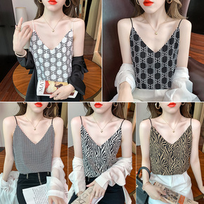 印花.千鸟格.斑马纹V领吊带女内搭宽松外穿上衣打底...