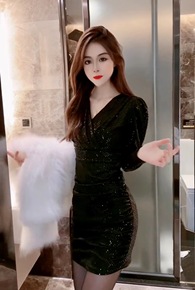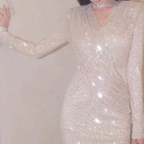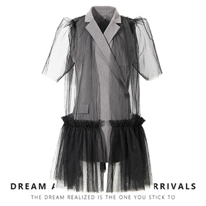 2021春夏装新款 性感名媛V领修身包臀网纱袖开叉...