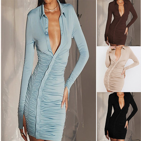 2021欧美女装新款亚马逊秋季时尚潮流褶皱收腰纯色...