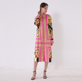 2021新款女装气质印花时尚连衣裙翻领长袖衬衫裙子...