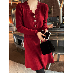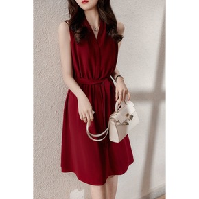 亚马逊夏季高腰珠光色吊带型气质通勤显瘦纯色红色连衣...