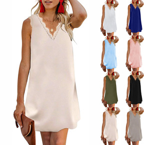 2021新款夏季无袖中腰系脖型气质通勤拼接不规则印...