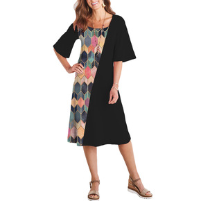 2021亚马逊欧美新款时尚印花拼色斜领连衣裙 喇叭...
