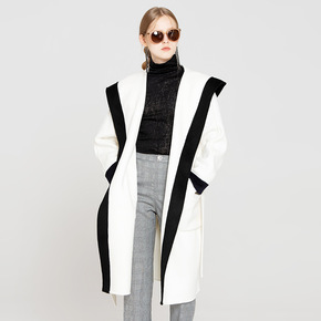 2018秋冬新款时尚气质白色连帽领双面呢羊毛长款大...