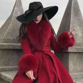 双面呢大衣女中长款大狐狸毛领2022春夏新款修身过...