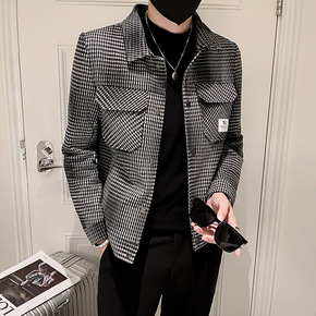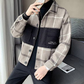 格子毛呢外套男2021年新款潮流冬装加厚保暖短款呢...