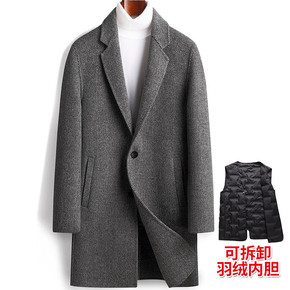 秋冬脱卸羽绒内胆双面呢大衣男士格子羊绒妮子外套中长...