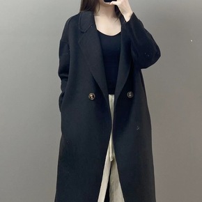 1123#黑色双面羊绒大衣女加长款过膝2021秋冬...