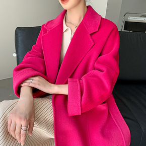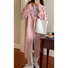 2022新款韩版博主款浪漫粉双面呢羊绒羊毛大衣中长...