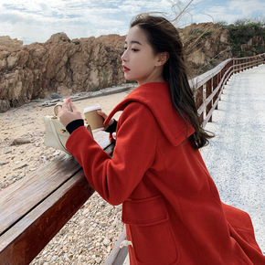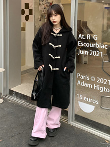 气质连帽牛角扣毛呢外套女冬季新款赫本风宽松休闲中长...