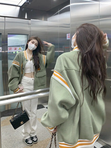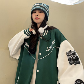 绿色棒球服女春秋2022年新款美式复古学生宽松立领...
