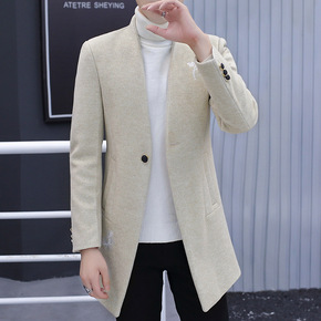 韩版冬季无领中长款呢子风衣男休闲修身帅气毛呢外套刺...