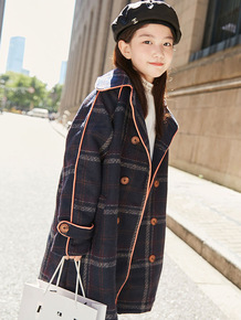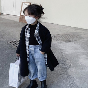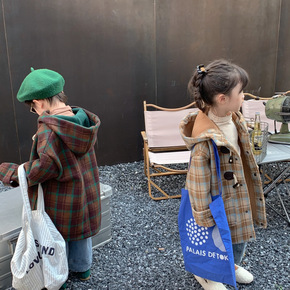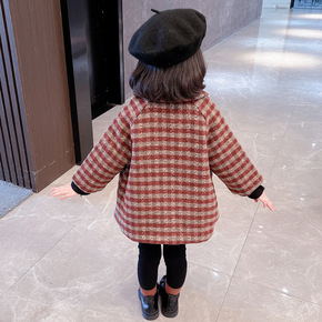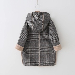 秋冬儿童宝宝复古格子中长款羊角扣毛呢外套男童女童连...