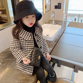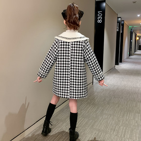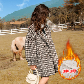 女童夹棉加厚毛呢大衣2021冬装母女装千鸟格中长款...