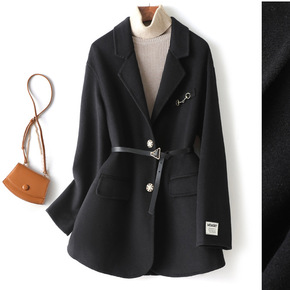 2021冬季新款女装双面毛呢收腰绑带风衣大衣毛呢中...