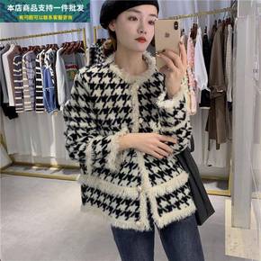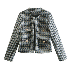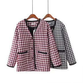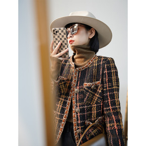 跨境女装拼色千鸟格小香风外套2022春秋新款格子时...