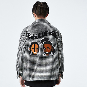 卡通人物刺绣千鸟格夹克男士ins欧美风嘻哈潮牌宽松...