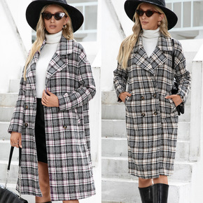 亚马逊2021西装领双排扣长款羊绒千鸟格毛呢大衣格...