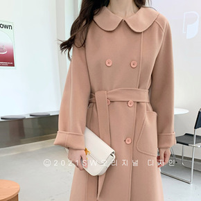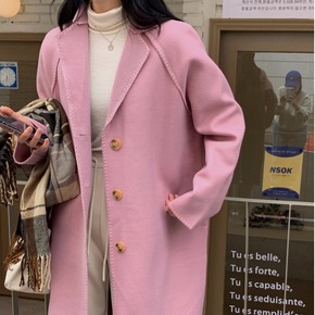 粉色双面羊绒尼大衣女冬季专机收边西装领单排扣长款毛...