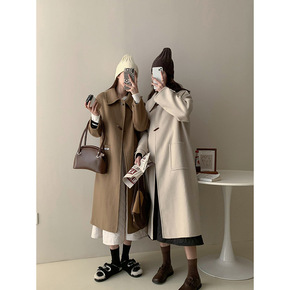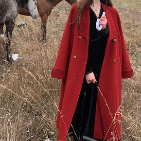 手缝手工双面羊毛大衣女 卷袖中长款宽松双面羊绒大衣...
