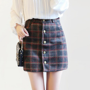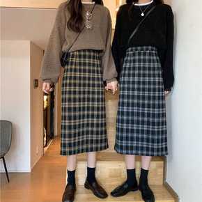 毛呢格子半身裙春秋2021中长款包臀裙高腰复古裙子...