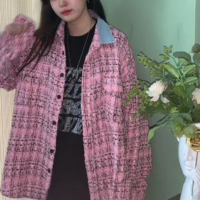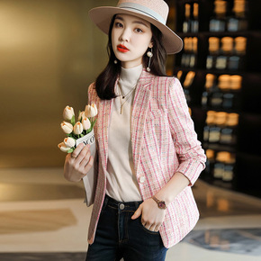 小香风粉色格子外套女春秋装2022新款设计感小众别...