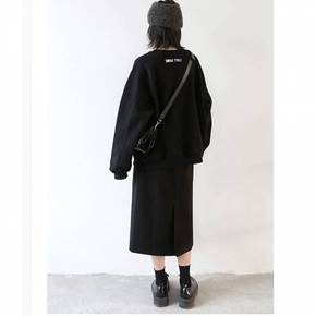 毛呢半身裙2021秋冬新款半身裙字开叉黑色松紧高腰...