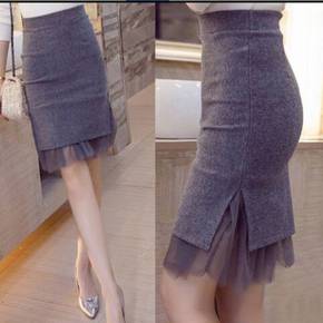 时尚新款加厚秋冬毛呢包臀裙半身裙网纱蕾丝包裙大码中...