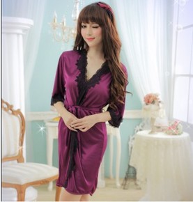 外贸欧美情趣低胸性感浴袍紫色高贵蕾丝黑边睡裙浴袍0...