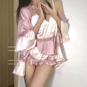 暧昧浴袍性感内衣高端缎面蕾丝睡衣女露背绑带套装睡裙...