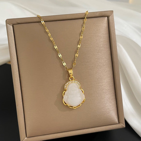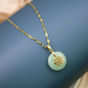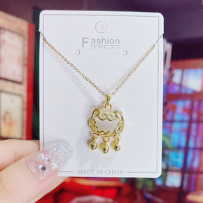 【钛钢真金电镀】直播款镶嵌仿和田玉流苏长命锁项链本...