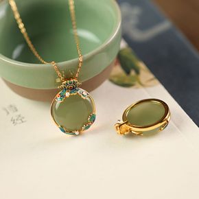 蔓时光S925银镀金镶嵌和田玉青玉蛋面烧蓝国风时尚...
