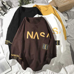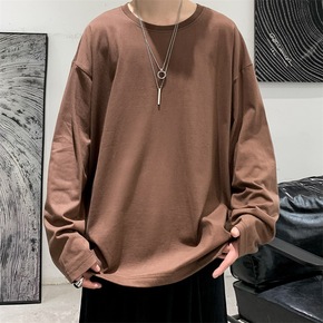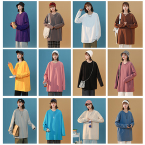秋季2021新款情侣长袖纯色宽松圆领体恤长袖潮流百...