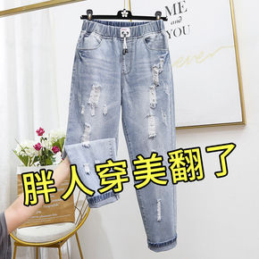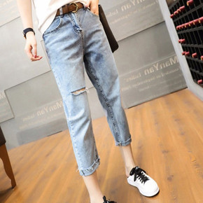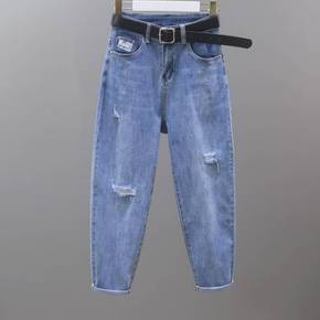 破洞牛仔裤女2022夏季新款宽松九分哈伦裤显瘦时尚...