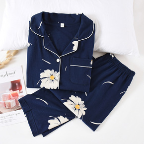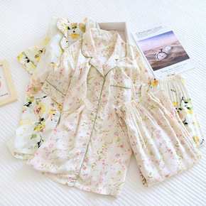 人棉开衫翻领短袖短裤睡衣套装女夏季薄款凉爽棉绸可外...