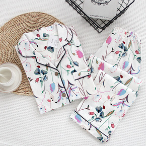 女士翻领人棉长袖长裤睡衣套装春夏秋薄款滑爽绵绸开衫...